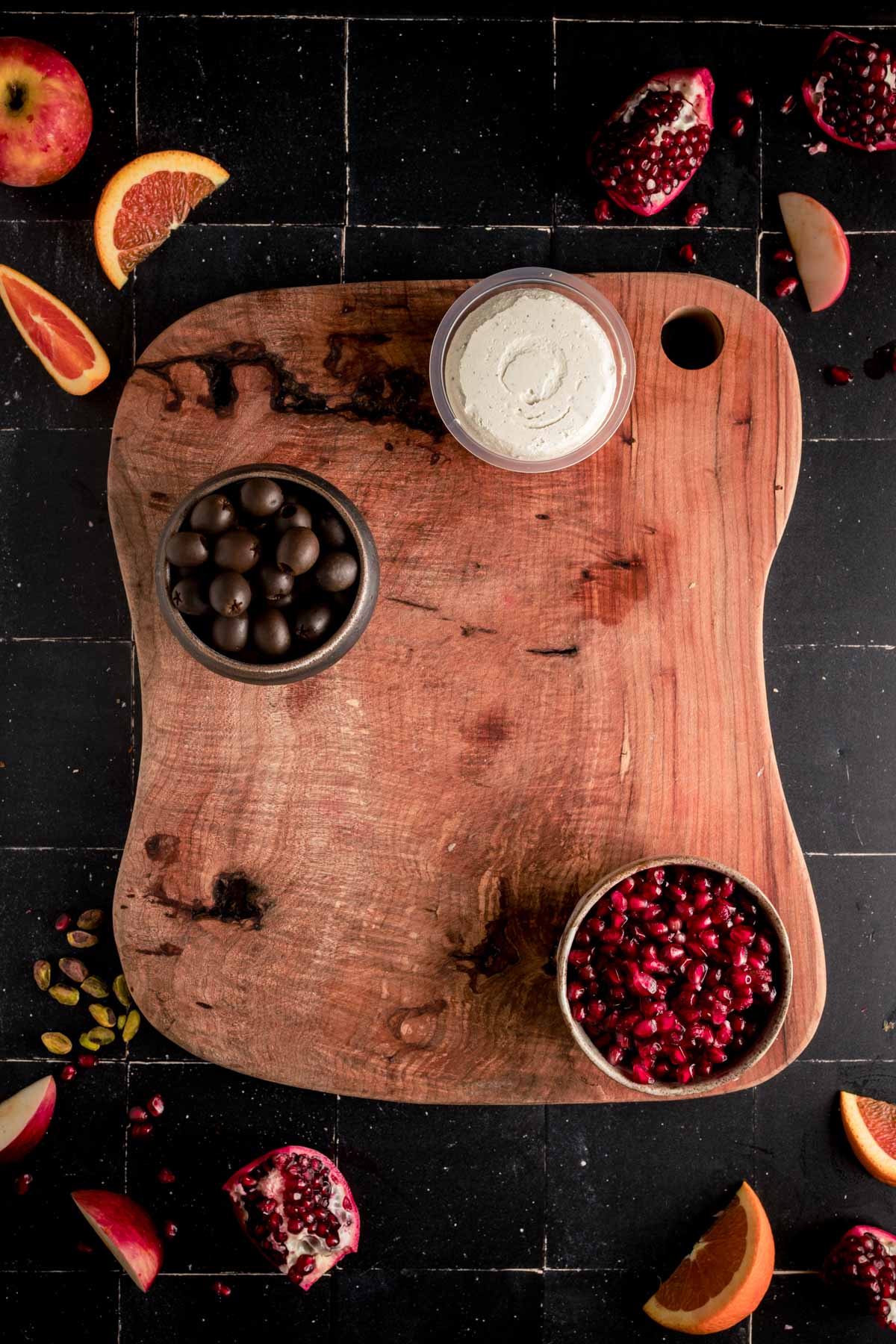 - Place the large circular items, such as cheese spread, bowl of olives, and pomegranate, on your wooden board. Spread out the fruit and veggies so that they are spaced out. Add crackers, followed by vegan cheese and meats. Finally, add sweets like chocolate and fill in gaps with your favorite nuts.